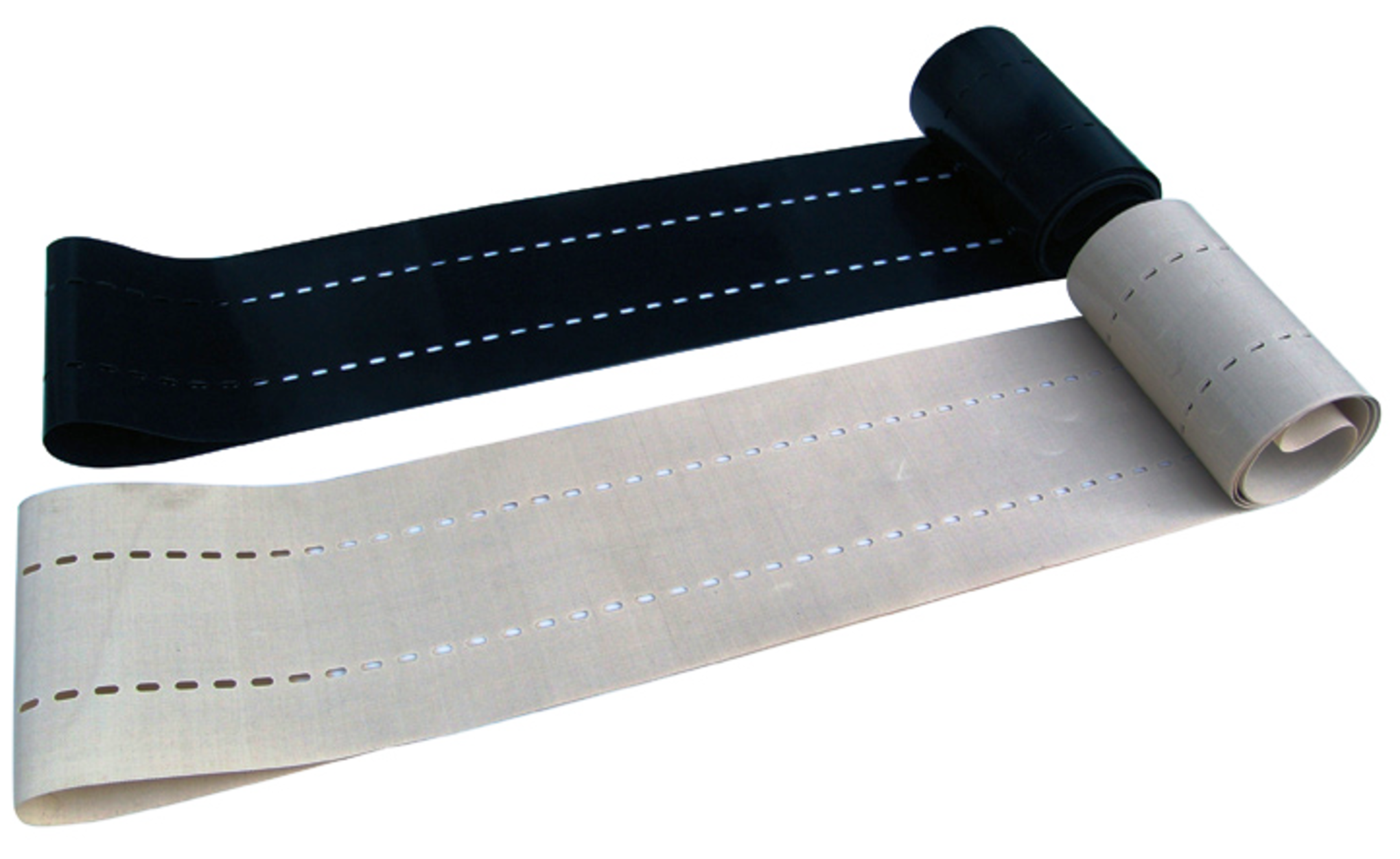 Bandas continuas en Teflón® (PTFE) negro antiestático y amarillo estático con guías perforadas, ideales para sistemas de transporte y sellado precisos. Ofrecen excelente resistencia térmica, control de fricción y alineación exacta en procesos industriales exigentes.